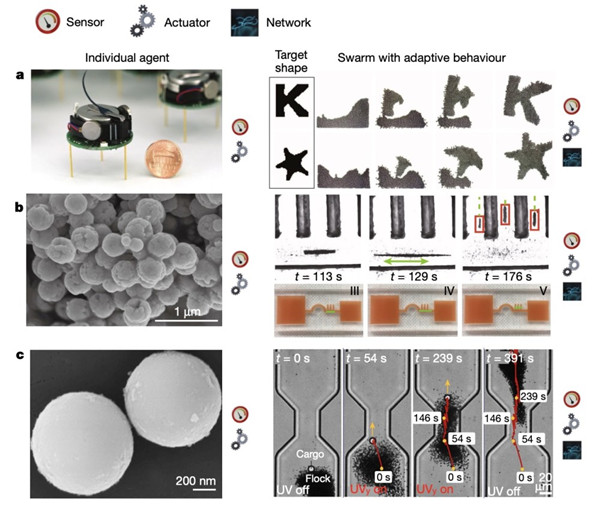 基于鏈形成、結構納米顆粒之間的排斥流體和吸引磁相互作用,并根據初始形狀,微群可以執行可逆各向異性變形、具有高模式穩定性的受控分裂和合并以及導航運動(dòng),但這些形狀自適應依賴(lài)于外部程序員的輸入、磁場(chǎng)控制等,因此粒子本身不會(huì )顯示出智能行為。