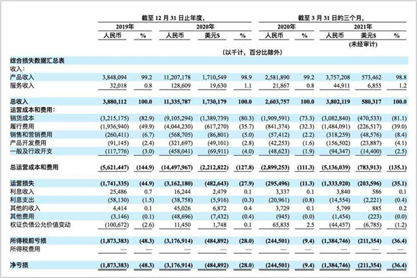 其凈虧損從2019年的18.73億元增長(cháng)到2020年的31.77億元。今年截至3月31日的前三個(gè)月,凈虧損從去年同期的2.45億元增至13.85億元。