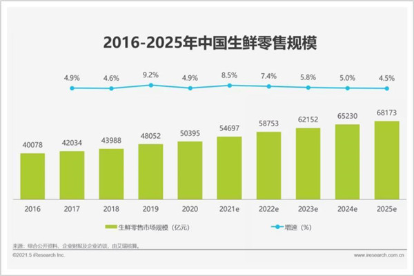相關(guān)數據顯示,近年來(lái),中國生鮮零售市場(chǎng)保持穩步增長(cháng),2020年中國生鮮零售市場(chǎng)規模超5萬(wàn)億元。艾瑞預計,到2025年中國生鮮零售市場(chǎng)規模將達到6.8萬(wàn)億元。