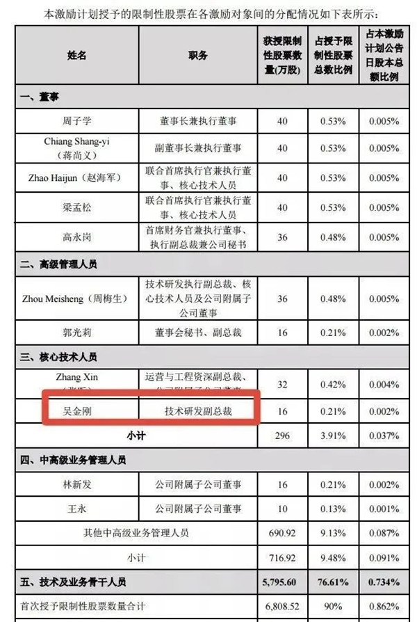 基金君發(fā)現,吳金剛獲得的16萬(wàn)股限制性股票看似很多,卻是核心技術(shù)人員中最少的。