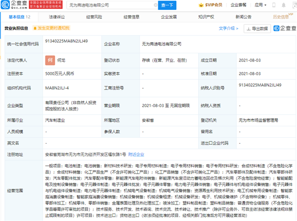 企查查 App 顯示,8 月 3 日,無(wú)為弗迪電池有限公司成立,法定代表人為何龍,注冊資本 5000 萬(wàn)元人民幣,經(jīng)營(yíng)范圍包含:電池制造;電池銷(xiāo)售;新材料技術(shù)研發(fā);電子專(zhuān)用材料制造;電子專(zhuān)用材料銷(xiāo)售;電子專(zhuān)用材料研發(fā)等。