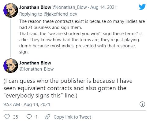 在其發(fā)布這些合同內容后,許多開(kāi)發(fā)者表示十分熟悉,并開(kāi)始猜測這家發(fā)行商到是誰(shuí),游戲《見(jiàn)證者》開(kāi)發(fā)者 Jonathan Blow 發(fā)帖回應:“我已經(jīng)猜出出版商是誰(shuí),因為我看過(guò)類(lèi)似的合同。”隨后解釋道:“這個(gè)問(wèn)題非常普遍,當你描述這些東西的時(shí)候,每個(gè)人都認為他們知道發(fā)行商是誰(shuí),但每個(gè)人的猜測卻又不同。”