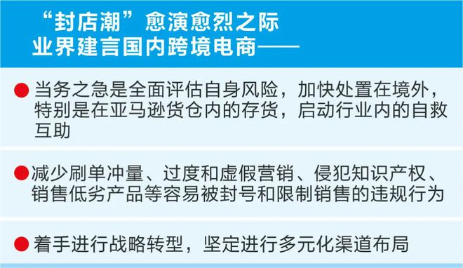 中南財經(jīng)政法大學(xué)數字經(jīng)濟研究院高級研究員金天在接受證券時(shí)報記者采訪(fǎng)時(shí)表示,對跨境電商而言,一旦出現封號、限制銷(xiāo)售,會(huì )面臨較大的資金和經(jīng)營(yíng)壓力,部分商家實(shí)際上屬于加杠桿運營(yíng),尤其面臨突出的資金鏈斷裂風(fēng)險。在封號愈演愈烈之際,企業(yè)當務(wù)之急是全面評估自身風(fēng)險,加快處置在境外,特別是在亞馬遜貨倉內的存貨,啟動(dòng)行業(yè)內的自救、互助;同時(shí),需要減少刷單沖量、過(guò)度和虛假營(yíng)銷(xiāo)、侵犯知識產(chǎn)權、銷(xiāo)售低劣產(chǎn)品等容易被封號和限制銷(xiāo)售的違規行為,因為從長(cháng)期來(lái)看強監管將是一種常態(tài),同類(lèi)行為在國內電商平臺的懲處力度也會(huì )不斷加強。