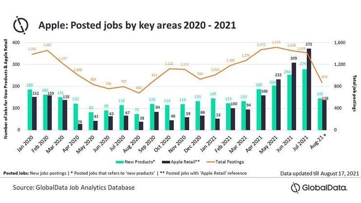 根據 GlobalData 對蘋(píng)果招聘的分析,過(guò)去數月里,蘋(píng)果增加了不少與產(chǎn)品開(kāi)發(fā)和零售運營(yíng)部門(mén)有關(guān)的崗位。