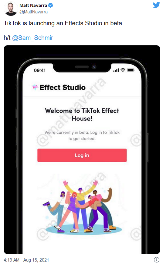 效果工作室是由社交媒體顧問(wèn)馬特·納瓦拉首次發(fā)現的。你可以在這個(gè)地址查看注冊頁(yè)面(在這里它被初步命名為 TikTok 效果屋):