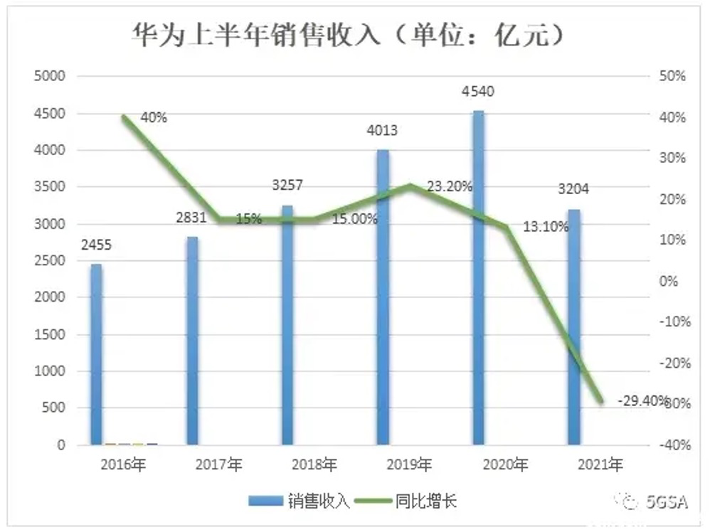 本月初華為公布了 2021 年上半年業(yè)績(jì),形勢不容樂(lè )觀(guān)。今年上半年華為實(shí)現銷(xiāo)售收入 3204 億元,比去年同比下降了 29.4%,這也是近五年來(lái)華為的半年營(yíng)收首次出現負增長(cháng)。