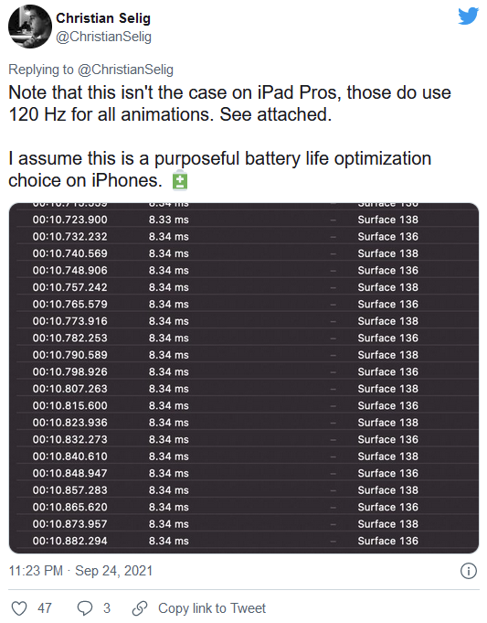 目前,由于對標準動(dòng)畫(huà)的支持有限,像滾動(dòng)這樣的互動(dòng)和關(guān)閉彈出窗口這樣的互動(dòng)之間會(huì )有明顯的區別。例如,如果你在 iPhone 13 Pro 或 Pro Max 上滾動(dòng)瀏覽 Twitter,你會(huì )看到流暢的滾動(dòng)體驗,但尚未更新到 120Hz 的動(dòng)畫(huà)被限制在 60Hz,而這些動(dòng)畫(huà)的流暢度明顯降低。這個(gè)反差問(wèn)題將隨著(zhù)開(kāi)發(fā)者在未來(lái)采用對 ProMotion 功能的全面支持而得到解決。