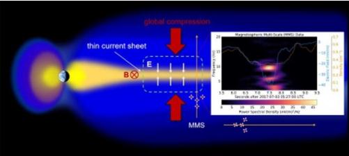 NRL 的科學(xué)家們一直在使用 MMS 數據來(lái)研究發(fā)生在地球磁尾的微尺度物理學(xué),磁尾是磁層的一個(gè)薄的部分。當地球的磁層被太陽(yáng)風(fēng)壓縮成一個(gè)薄薄的電流片時(shí),磁尾就形成了,這為研究磁重聯(lián)創(chuàng )造了一個(gè)理想的位置。
