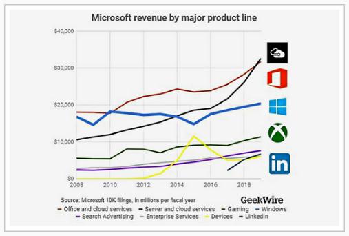 ▲微軟各產(chǎn)品線(xiàn)收入變化 來(lái)源:GeekWire
