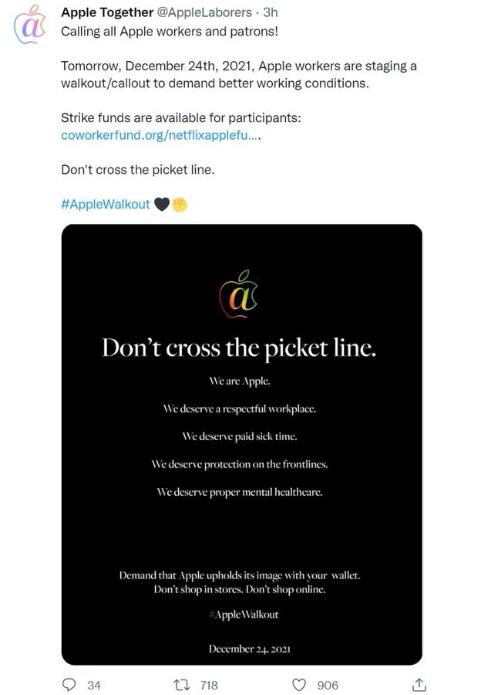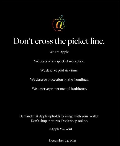 盡管 Apple Together 目標是讓所有蘋(píng)果員工罷工或觸動(dòng),但其也呼吁顧客平安夜不要在蘋(píng)果購物。