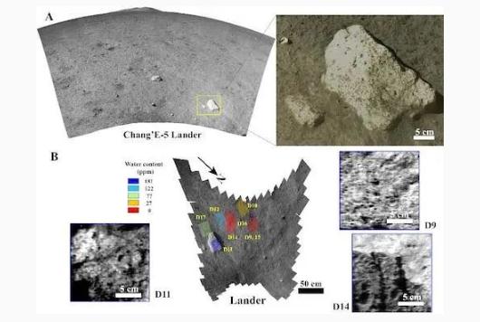 數據分析結果為月球上真的存在水增加了新的確鑿證據:嫦娥五號采樣區的水含量在 120 ppm(百萬(wàn)分之 120)以下,而巖石中的水含量約為 180 ppm。