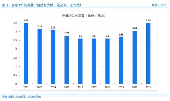 根據IDC在1月12日發(fā)布的初步數據,2021年全球PC出貨量同比大增14.8%,重返2012年的3.49億臺高位,較2017年行業(yè)低點(diǎn)反彈了34%以上。