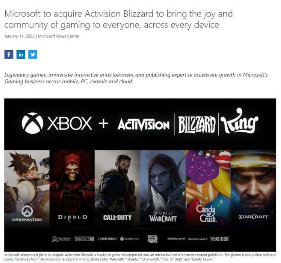 1 月 18 日,微軟公司宣布計劃收購游戲開(kāi)發(fā)和互動(dòng)娛樂(lè )內容發(fā)行商動(dòng)視暴雪公司。據其官網(wǎng)公告顯示,此次收購將加速微軟游戲業(yè)務(wù)在移動(dòng)、PC、游戲機和云領(lǐng)域的增長(cháng),并將為搭建元宇宙提供基礎。