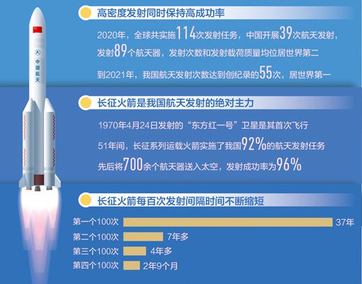 據統計,2021年全年我國航天發(fā)射次數達到55次,位居世界第一。從中國空間站建設取得階段性重大勝利,到“天問(wèn)一號”拓展我國星際探索新旅程,在航天發(fā)射數量再次刷新歷史紀錄的這一年中,我國航天事業(yè)取得令人矚目的成就,一批航天重大計劃達成或逐步接近設定目標,更長(cháng)遠的探索計劃則蓄勢待發(fā)。