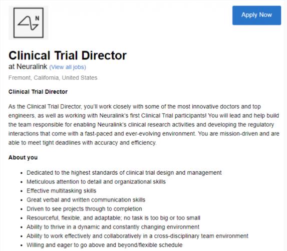據 The Verge 報道,埃隆·馬斯克的腦機接口公司 Neuralink 最新發(fā)布的招聘信息顯示,該公司正在尋求招聘一名“臨床試驗主任”,這個(gè)職位可以幫助該公司實(shí)現其既定目標,即在真實(shí)的人身上測試其大腦植入物。