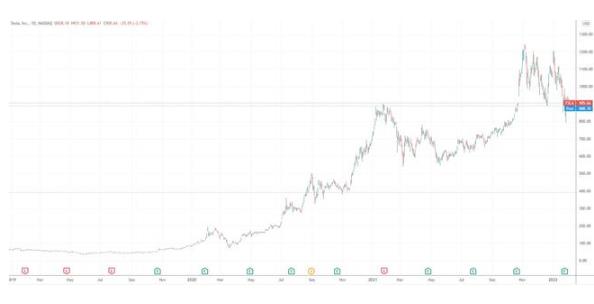結果相信大家也很清楚,特斯拉的股票連續瘋漲了兩年,從2020年的疫情底到去年年底的高點(diǎn),其股價(jià)一共翻了17倍。