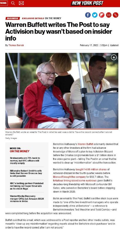 另?yè)都~約郵報》報道,《華爾街日報》最先報道了伯克希爾·哈撒韋公司購買(mǎi)動(dòng)視暴雪股票的時(shí)間,最初還聲稱(chēng)這些股票的平均價(jià)格約為每股66.53美元,后來(lái)更新為美股77美元的平均價(jià)格。