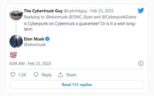 馬斯克還在回答另一個(gè)問(wèn)題時(shí),確認 Cybertruck 電動(dòng)皮卡將支持玩《賽博朋克 2077》游戲,IT 之家了解到,Cybertruck 預計將于 2023 年開(kāi)始交付。