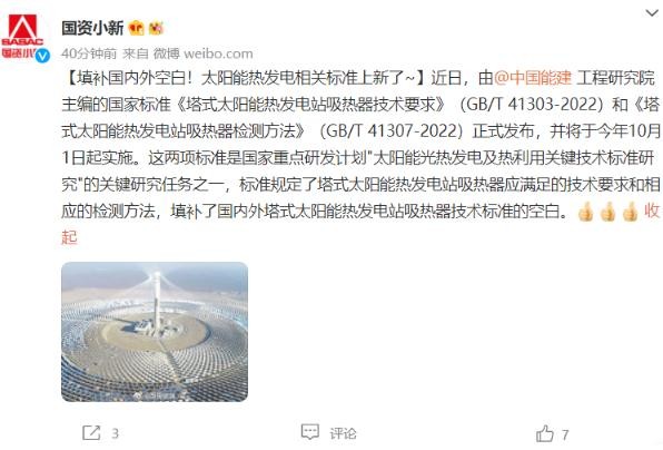 據國務(wù)院國資委新聞中心消息,近日,由中國能建工程研究院主編的國家標準《塔式太陽(yáng)能熱發(fā)電站吸熱器技術(shù)要求》(GB / T 41303-2022)和《塔式太陽(yáng)能熱發(fā)電站吸熱器檢測方法》(GB / T 41307-2022)正式發(fā)布,并將于今年 10 月 1 日起實(shí)施。