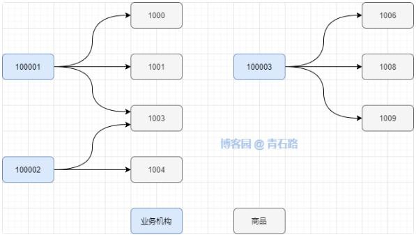 業(yè)務(wù)機構下銷(xiāo)售商品,同個(gè)業(yè)務(wù)機構可以銷(xiāo)售不同的商品,同個(gè)商品可以在不同的業(yè)務(wù)機構銷(xiāo)售,也就說(shuō):業(yè)務(wù)機構與商品是多對多的關(guān)系
