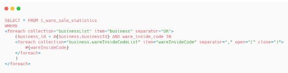 同樣是利用 Mybatis 的 動(dòng)態(tài) SQL ,將 business_id 列表拼在一起、 ware_inside_code 拼在一起,類(lèi)似如下