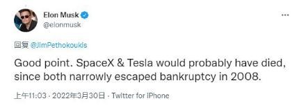 “好觀(guān)點(diǎn)。SpaceX 和特斯拉可能已經(jīng)死了,因為這兩家公司都在 2008 年險些破產(chǎn)。”馬斯克回應道。