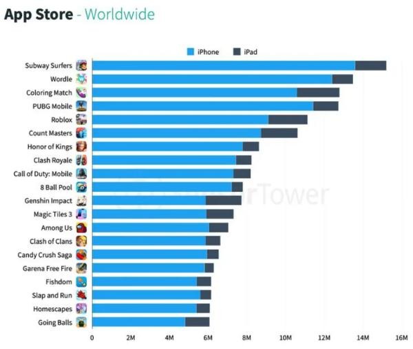 游戲方面,《地鐵跑酷》是下載次數最多的游戲,2022 年一季度的下載量超過(guò) 1500 萬(wàn)次。