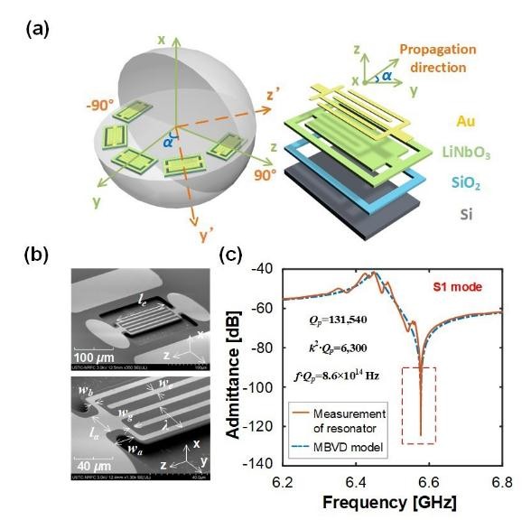 研究人員提出了一種基于三維歐拉角 α 在 x-cut 單晶鈮酸鋰壓電薄膜上設計并制備高頻 MEMS 諧振器的方法。通過(guò)設計諧振器的電極結構,工作于 6.5 GHz 的 S1 振動(dòng)模態(tài)被激發(fā),并且當聲波傳播方向(α)位于 15° 時(shí),諧振器并聯(lián)諧振頻率(fp)處的品質(zhì)因數(Qp)高達 131540,對應的諧振器優(yōu)值 k2?Qp 和 fp?Qp 分別達到 6300 和 8.6×1014Hz(圖 1)。