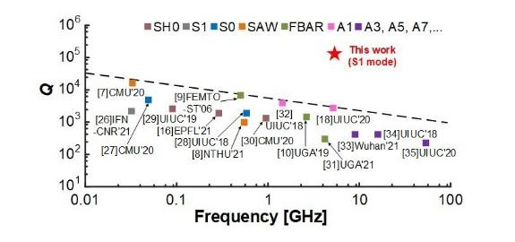 ▲ 圖 2.新型 MEMS 諧振器與近 10 年其它鈮酸鋰諧振器 Q 值的比較