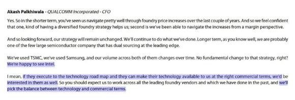 高通 CFO 在摩根大通 JPM 大會(huì )上表示,它將在合適的商業(yè)條款下采用英特爾的技術(shù)進(jìn)行產(chǎn)品代工。
