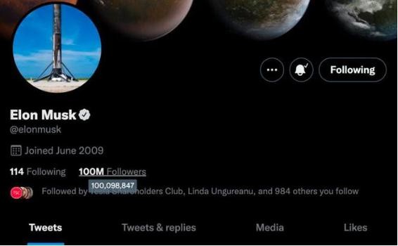 特斯拉首席執行官埃隆·馬斯克(Elon Musk)的推特粉絲正式突破 1 億大關(guān),成為該平臺上第六個(gè)粉絲數量達到九位數的大V。