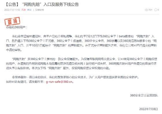 360 安全衛士運營(yíng)團隊今日發(fā)布公告,由于產(chǎn)品的升級和調整,將于 7 月 12 日下線(xiàn) 360 安全衛士 beta 版本的 “網(wǎng)購先賠”入口,然后逐步下線(xiàn) 360 安全衛士正式版、360 安全衛士極速版、360 企業(yè)安全云、360 殺毒以及 360 瀏覽器各版本中的“網(wǎng)購先賠”入口,并于 10 月 1 日起停止“網(wǎng)購先賠”的理賠服務(wù)。