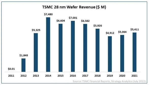 據 Strategy Analytics 機構報告,在經(jīng)歷了十年后,臺積電 28nm 芯片仍擁有可觀(guān)的收益。臺積電、聯(lián)華電子和中芯國際正在進(jìn)一步擴大 28nm 產(chǎn)能。2021 年,28nm 晶圓代工總營(yíng)收超過(guò) 72 億美元(約 486.72 億元人民幣),臺積電占約四分之三的營(yíng)收份額。