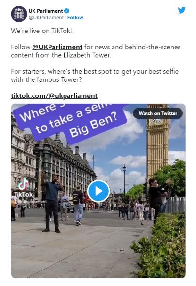 公開(kāi)資料顯示,TikTok 是中國科技公司字節跳動(dòng)旗下的短視頻應用,因其輕松有趣,深受海外網(wǎng)友喜愛(ài)。為充分接觸年輕一代,英國議會(huì ) 7 月 27 日在社交媒體上宣布,已在 TikTok 開(kāi)設了賬號,并發(fā)布了第一條視頻,推廣英國景點(diǎn)大本鐘。