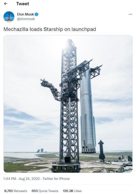 8 月 23 日,SpaceX 用 Mechazilla 巨型機械臂將 7 號超級重型助推器放置至 143 米高的發(fā)射塔。公司首席執行官埃隆·馬斯克(Elon Musk)在社交媒體推特上慶祝了這一工作。他發(fā)布了一張關(guān)于機械臂牢牢抓住 7 號超級重型助推器的照片,并配文稱(chēng),“Mechazilla 已經(jīng)將星際飛船裝載到發(fā)射臺”。