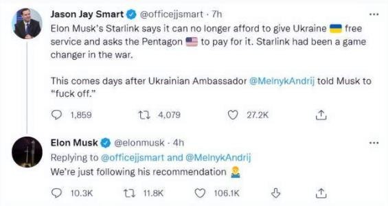 因此,有烏克蘭媒體人把“星鏈”停止為烏克蘭提供協(xié)助,和馬斯克被梅爾尼克怒斥一事聯(lián)系了起來(lái)。正是在這種說(shuō)法下,馬斯克作出了前文所提到的回復。