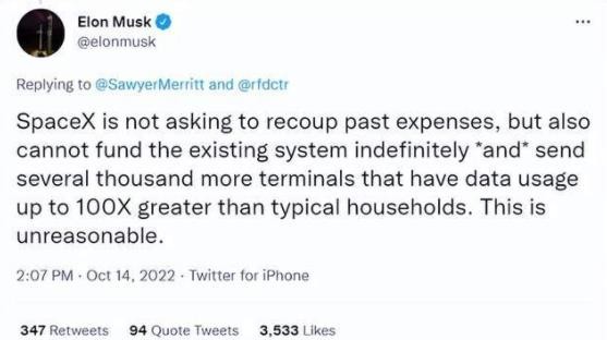 關(guān)于“星鏈”費用的問(wèn)題,馬斯克表示 SpaceX 目前“向數千個(gè)數據使用量高達普通家庭 100 倍的終端發(fā)送信號”,為此耗資巨大,雖然 SpaceX 不打算向烏克蘭索要過(guò)去的服務(wù)費用,但馬斯克表示“不能無(wú)限期地為現有系統提供資金”。美國 CNN 新聞透露,馬斯克曾聯(lián)系美國國防部,要求后者為“星鏈”項目在烏克蘭的投資“買(mǎi)單”。