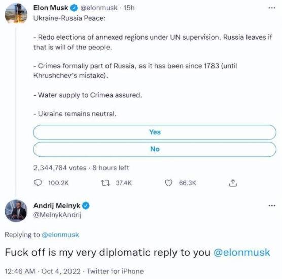 然而在 10 月 4 日,馬斯克突然在推特上發(fā)文點(diǎn)評俄烏局勢,并提出了自己所謂“解決俄烏問(wèn)題的和平計劃”,稱(chēng)烏克蘭應當在“四地公投入俄”和克里米亞等方面向俄羅斯妥協(xié),這一發(fā)聲激起了烏克蘭方面的猛烈抨擊。