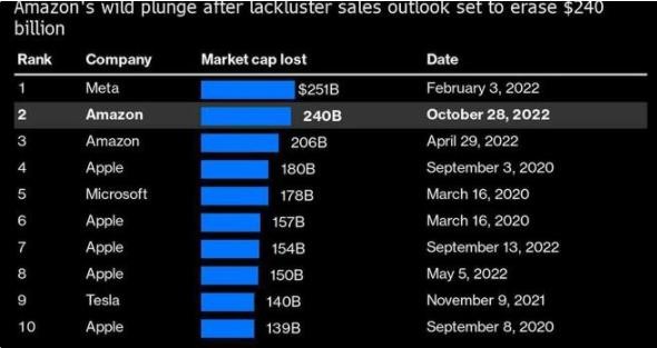 亞馬遜公布不及分析師預期的第三季度財報和令人失望的業(yè)績(jì)展望后,投資者紛紛拋售其股票,導致該公司股價(jià)連續暴跌,市值周五一度跌破 1 萬(wàn)億美元(約 7.22 萬(wàn)億元人民幣)。