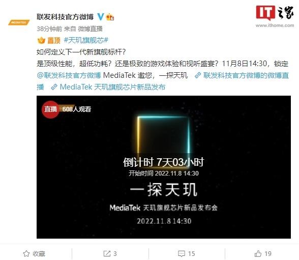 聯(lián)發(fā)科今日宣布將于 11 月 8 日 14:30 舉行天璣旗艦芯片新品發(fā)布會(huì ),預計會(huì )上會(huì )正式推出聯(lián)發(fā)科天璣 9200 移動(dòng)處理器。