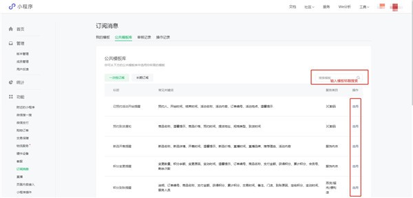3.點(diǎn)擊選用按鈕就可以去搜索自己想要的訂閱消息了,在輸入框中輸入消息標題,然后點(diǎn)擊搜索按鈕搜索出自己想要的消息,點(diǎn)擊選用進(jìn)入訂閱消息設置。