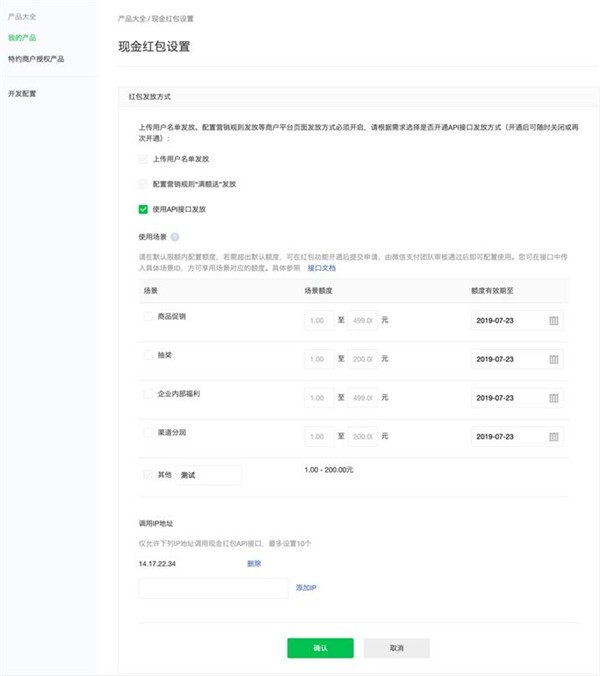 這邊有一點(diǎn)需要提醒一下的是,如果需要發(fā)送1元以?xún)鹊募t包(最底0.3元),修改場(chǎng)景額度的時(shí)候需要填寫(xiě)申請原因,這邊就不多說(shuō)了,根據實(shí)際情況填寫(xiě)提交,審核通過(guò)后就獲得權限了。