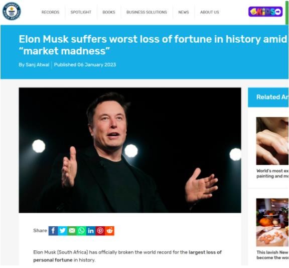 吉尼斯世界紀錄官方宣布,埃隆?馬斯克(南非)正式打破了歷史上最大的個(gè)人財富損失世界紀錄。