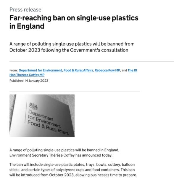 英國環(huán)境、食品和鄉村事務(wù)部表示英國消費者每年使用 27 億件一次性餐具,而其中只有約 10% 被回收。該部門(mén)表示在發(fā)布本公告之前征得了公眾意見(jiàn),所咨詢(xún)的 95% 的人都贊成這項禁令。