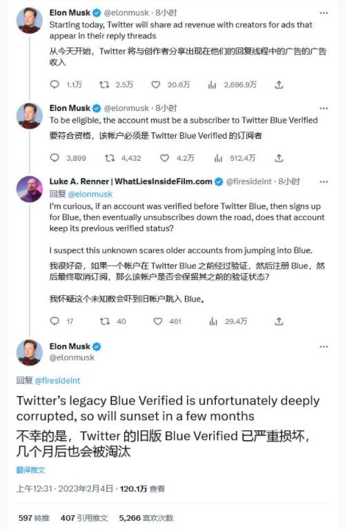 馬斯克在本周五的推文中表示:“Twitter 將于今天開(kāi)始,向創(chuàng )作者分享嵌入其推文評論中的廣告收益”。