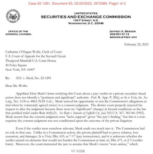 本月初,馬斯克在特斯拉股東發(fā)起的集體訴訟中取得勝利。美國舊金山陪審團裁定,馬斯克的私有化推文沒(méi)有違反特定證券法,不需要為誤導投資者承擔責任。馬斯克在紐約第二巡回上訴法院提起上訴,試圖撤銷(xiāo)與 SEC 和解協(xié)議的部分條款。馬斯克的律師稱(chēng),股東訴訟的判決應該在巡回上訴法院的審判中得到考慮。