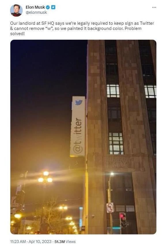馬斯克在照片配文中寫(xiě)道:“我們舊金山總部的房東說(shuō),法律要求保留推特的標識,不能刪除‘w’,所以我們把它涂成了背景色。這樣問(wèn)題就解決了!”
