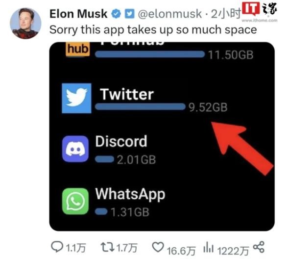 億萬(wàn)富翁馬斯克今日在 Twitter 上分享了一張手機存儲空間的截圖,顯示 Twitter 應用占用了 9.52 GB,比大部分其他應用都多,他在推文中為此向用戶(hù)道歉。