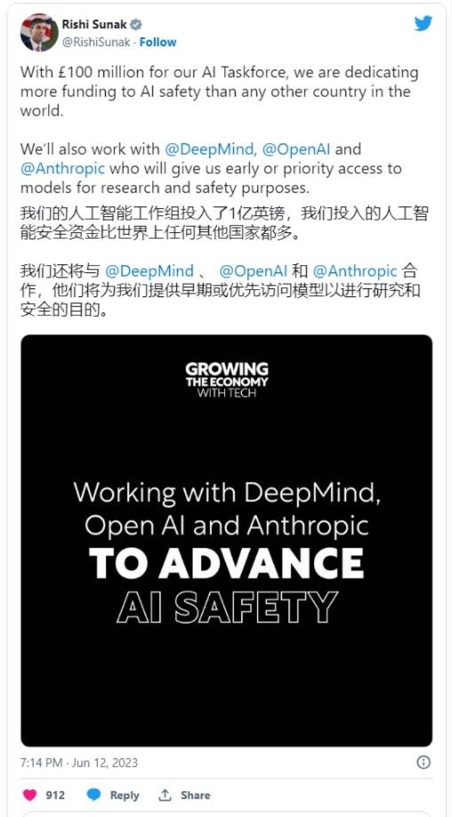 英國首相里希?蘇納克(Rishi Sunak)發(fā)布推文,表示正在與 DeepMind,OpenAI 和 Anthropic 合作,打造基于研究和安全目的的早期、優(yōu)先訪(fǎng)問(wèn)模型。