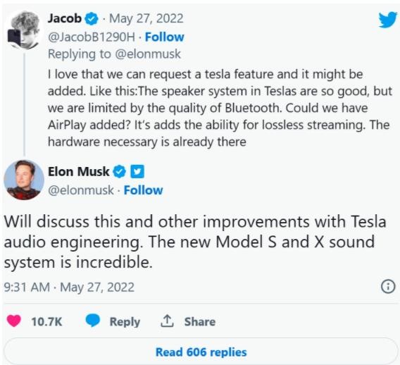 馬斯克在一年以前曾在推特上表示,特斯拉汽車(chē)未來(lái)將考慮增加蘋(píng)果隔空播放(AirPlay)支持,以提升 iPhone 無(wú)線(xiàn)播放音樂(lè )時(shí)的音頻質(zhì)量,馬斯克當下兌現了他此前的承諾,特斯拉汽車(chē)有望在近期獲得 AirPlay 功能。